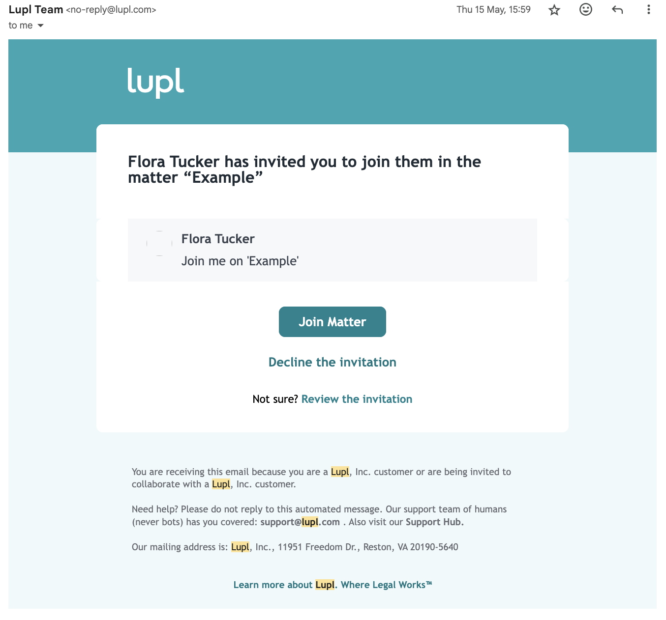 To view, accept, or decline Matter invitations within Lupl, the recipient will need to sign up to Lupl using the email address they received Matter invitations to.