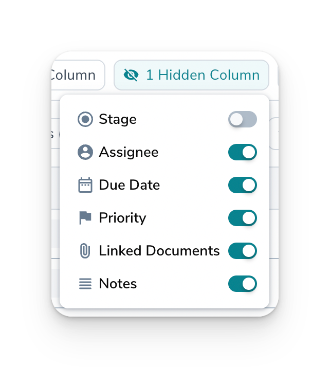 In your Workstream, look for the button that either says "Hide Column(s)" or "[1] Hidden Column".