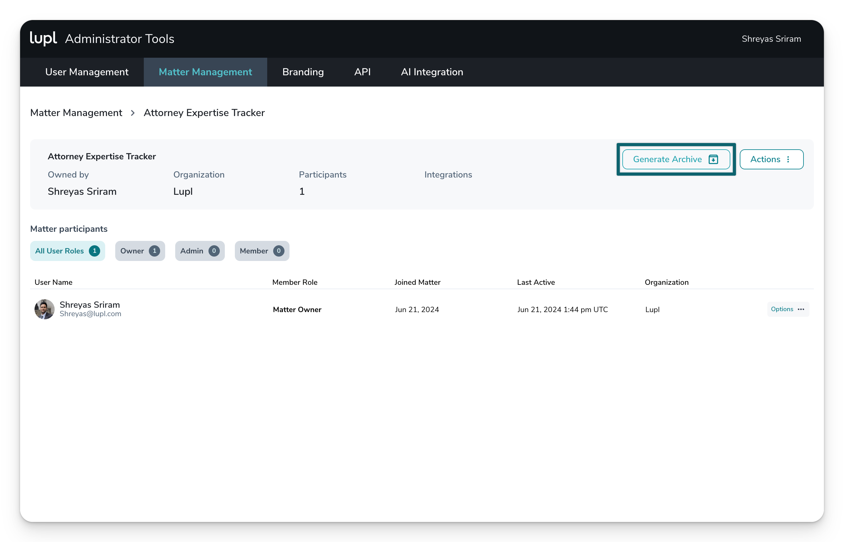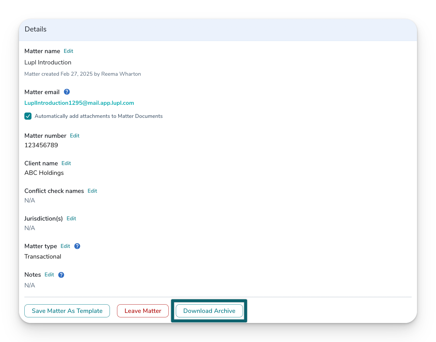 - Within the Details section of each Lupl matter, each team member has an option to generate a Matter Archive.